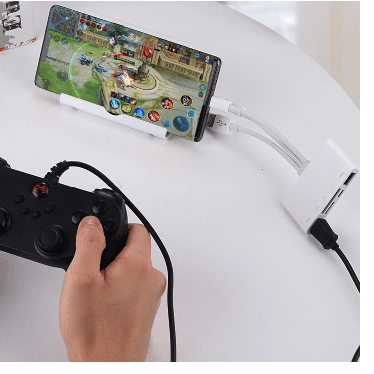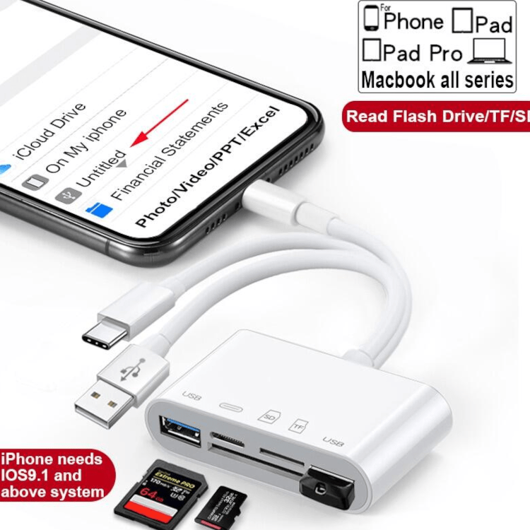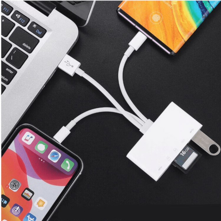1x (10 cm) Lightning / USB A / USB C auf SD / Micro SD Kartenlesegerät mit Dual USB A / Lightning Ladeadapter.